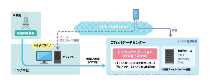 TNCは2020年、オンプレミス型リモコンサーバーの2回目の更新期を前に、放送界で前例がなかったサーバーのクラウド化を決断。堅牢なファシリティ上に設置された「QTPRO IaaS」を選ぶとともに、TNC 本社と仮想基盤を閉域網で結ぶ「QT PRO VLAN」を導入し、カスタマイズ性と拡張性に富んだクラウド環境を実現した。仮想サーバーのHA機能(自動フェイルオーバー)に加え、デフォルトでファイアウォールを備えるなど、セキュリティや冗長性の面での手厚い配慮も、導入を後押しするメリットとなった。
